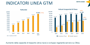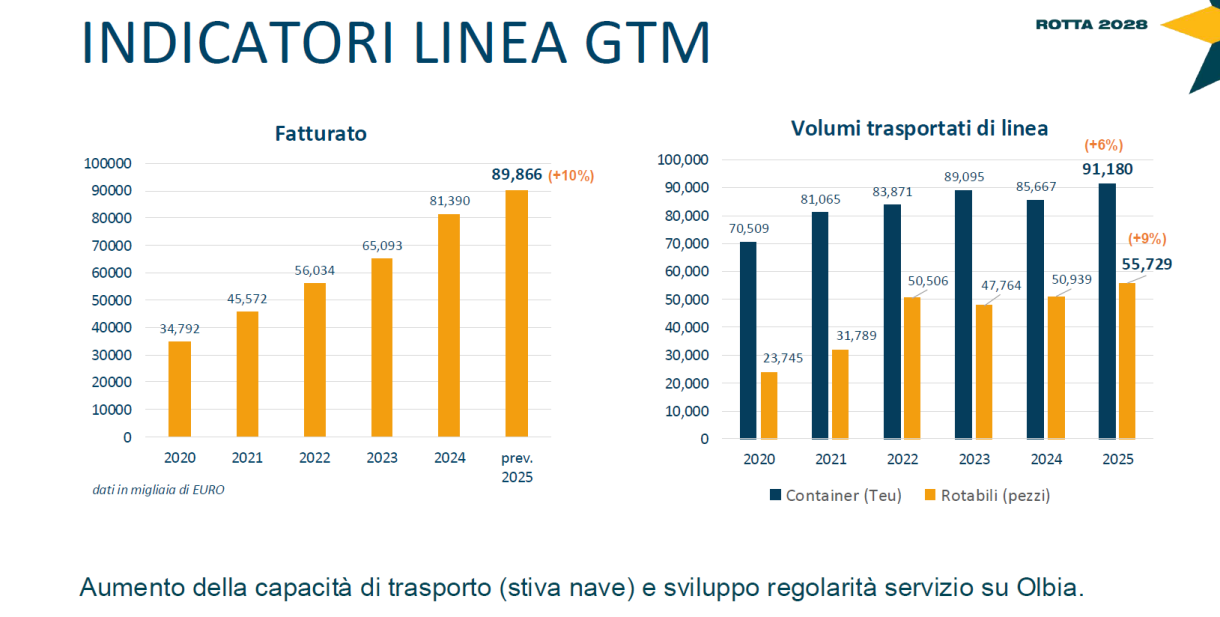 L’incremento del fatturato di GTM (circa 90 milioni, +10% sul 2024) riguarda sia il trasporto di container (91.180 TEU, +6%) che i rotabili (55.729 pezzi, +9%) a seguito della maggiore capacità di stiva e